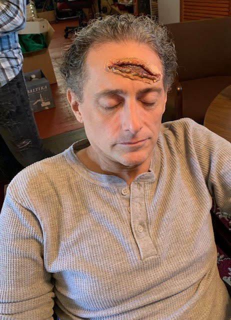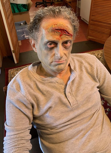 After arriving, Zombie Alicia (who had prepared herself and Ryan before coming) applied the zombie makeup to John, starting with the large gash made from latex and paper towels.