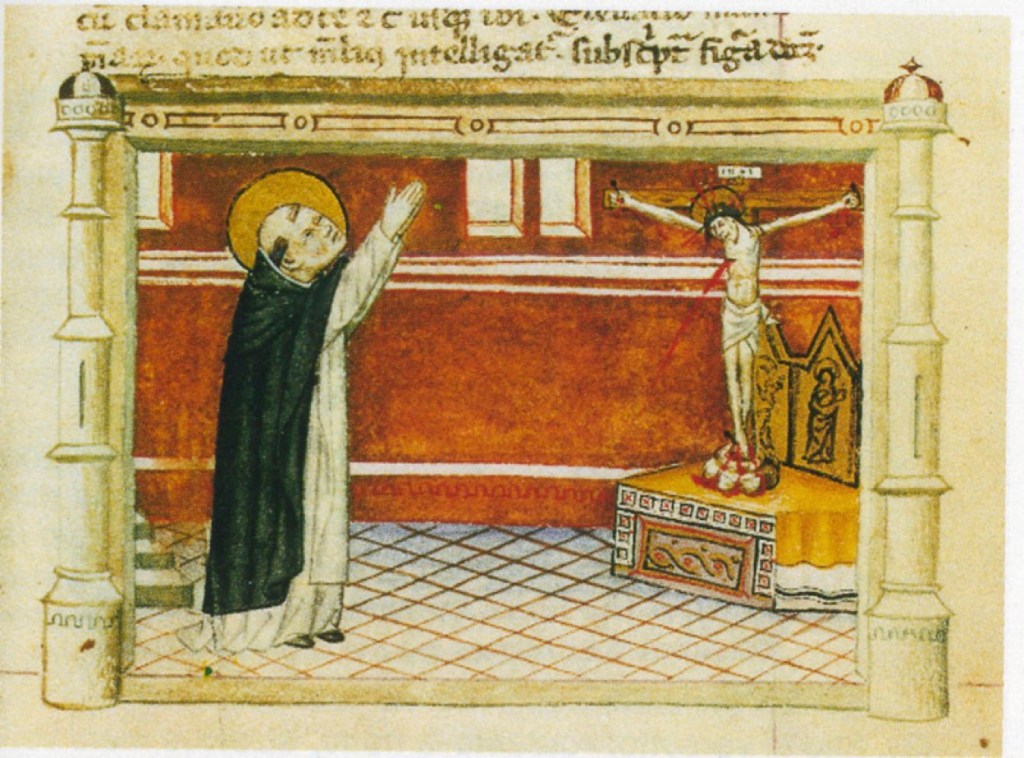These are from a Medieval codex depicting two modes of prayer: the sixth mode of prayer, Imploring divine power (standing, arms outstretched), and the seventh mode of prayer: ecstasy (standing, arms held directly overhead).