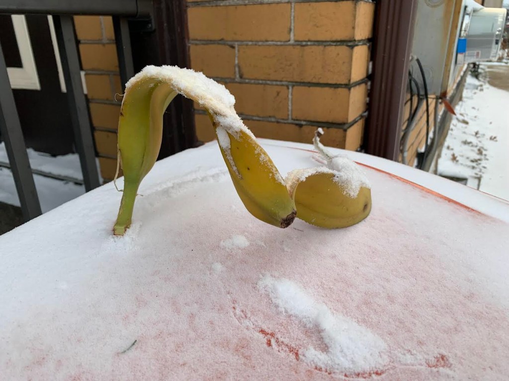 I used to eat a banana a day, but stopped for awhile, as an experiment, but I just tossed a peel away since I decided I should eat them regularly again. On the lighter side, see below for a banana peel I discarded last winter.