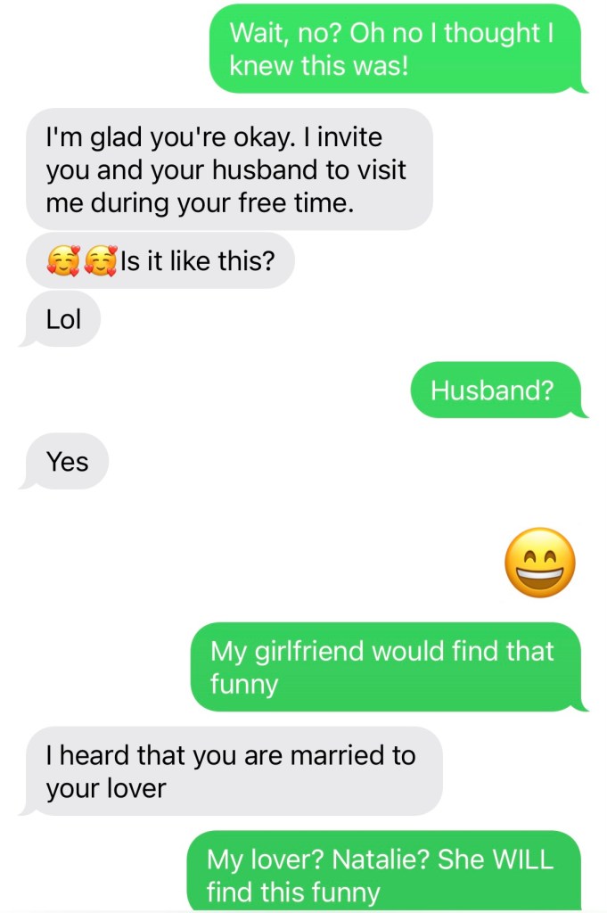 Just as I was telling a friend about my texting improv with a scammer, my phone pinged with a third. While the last one was not a good improviser (see previous blog posts for #1 and #2), this one had a little more going for him/her. I decided to get a little more baroque in my replies.