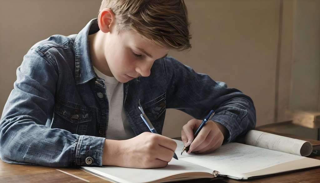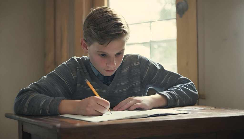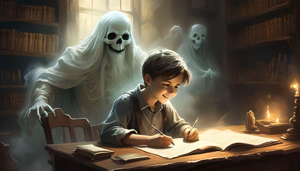 My prompt: “A 14 year old boy sitting at a desk and writing in a journal with the ghost of an older man standing behind him and smiling encouragingly.”