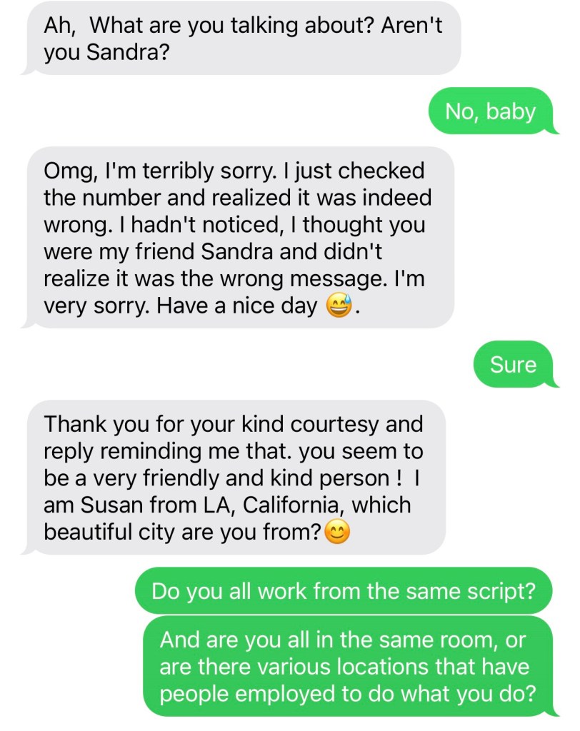 Last week I had a half dozen of those wrong number scam messages. Frequent readers of my blog know that I usually like to play along with them. But lately I’ve decided to play against them and see what happens.