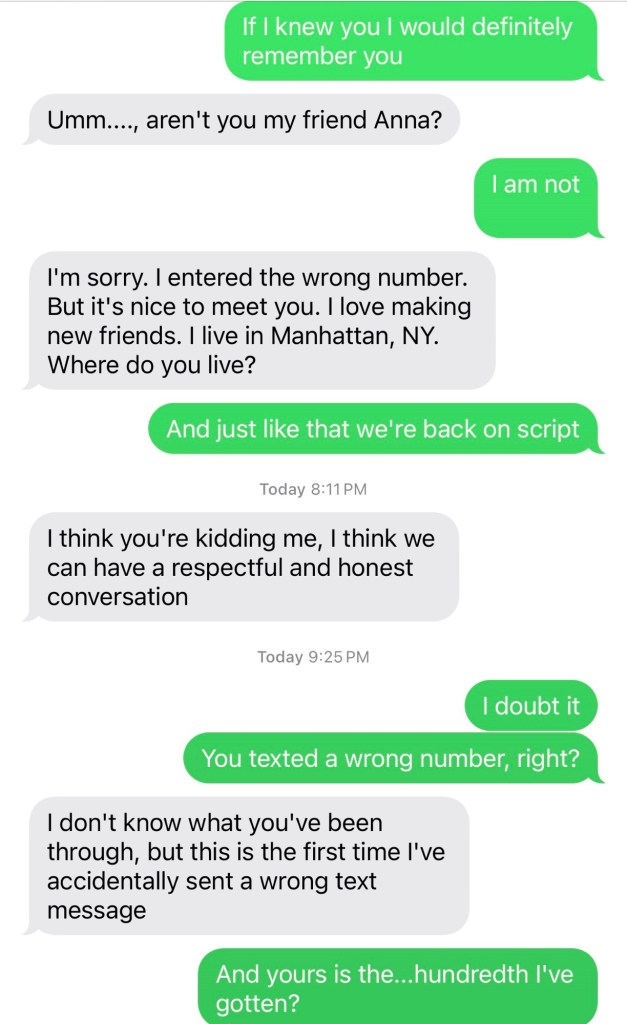 Another wrong number text message hit my phone this past weekend. “She” started on the offensive (there’s probably some chess gambit I could refer to here) but I hit back immediately.