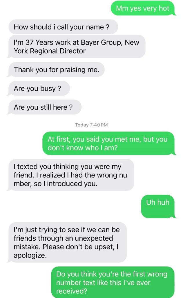 When I started to get the wrong number text scams, they at least tried to stay on script for awhile. Now, the present the introduction and—violating the first rule of improv—say, “Yes, but” to themselves. There’s no continuity to the idea that this is a wrong number…unless they are psychic and read my mind to know I’m not their friend.