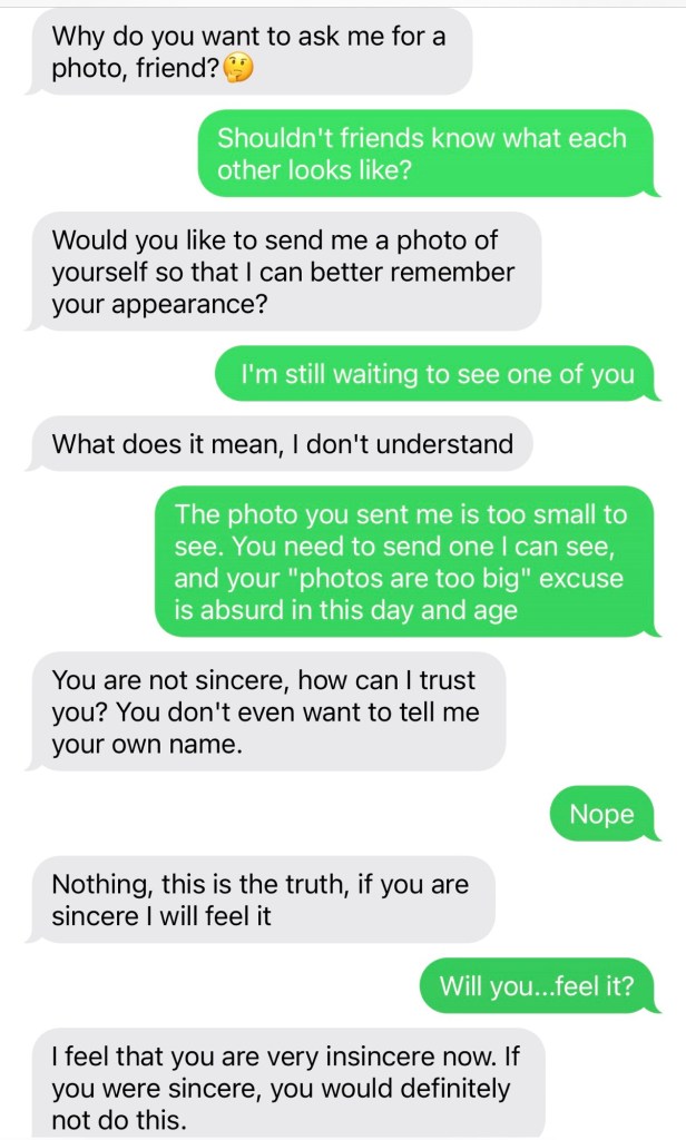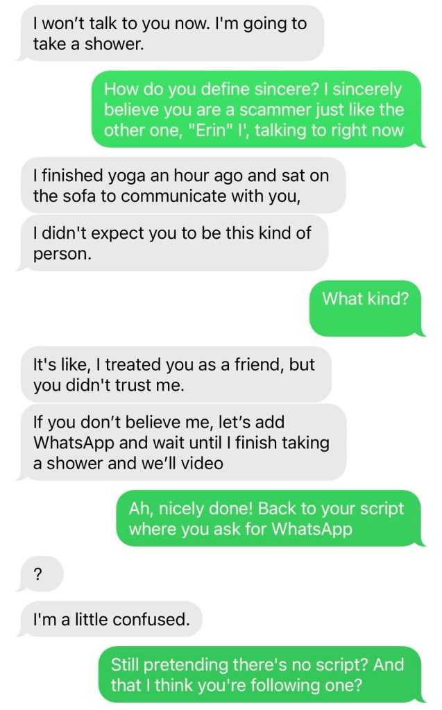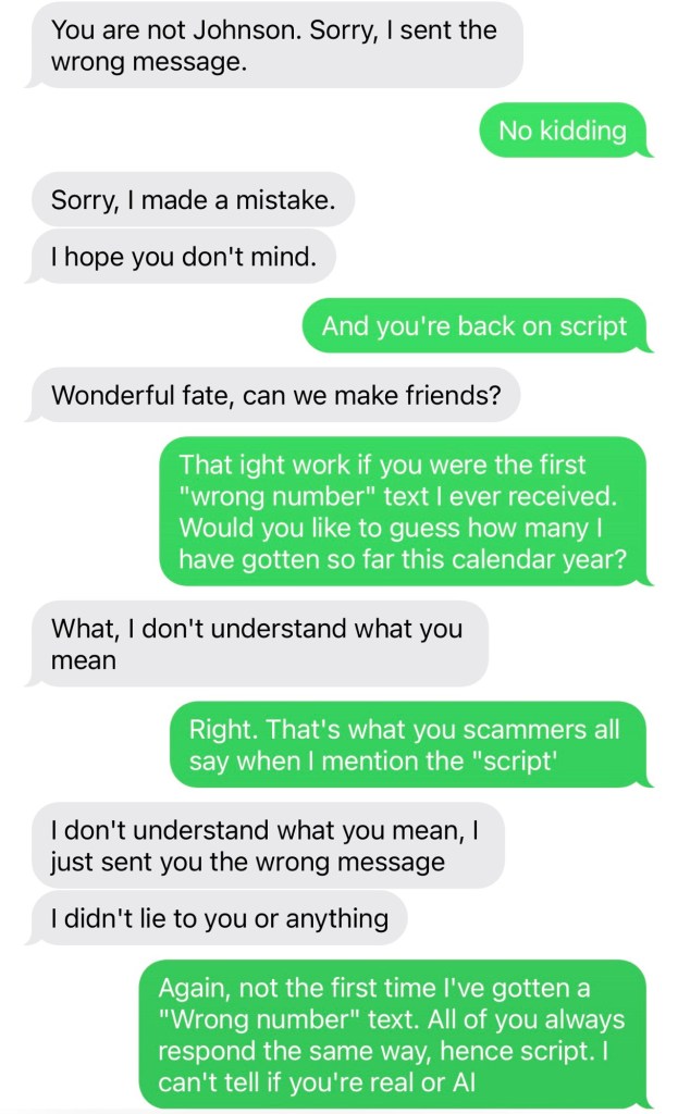 I was beset and besieged by 2 wrong number scammers at once. The first one kept denying there was a script while staying on it.