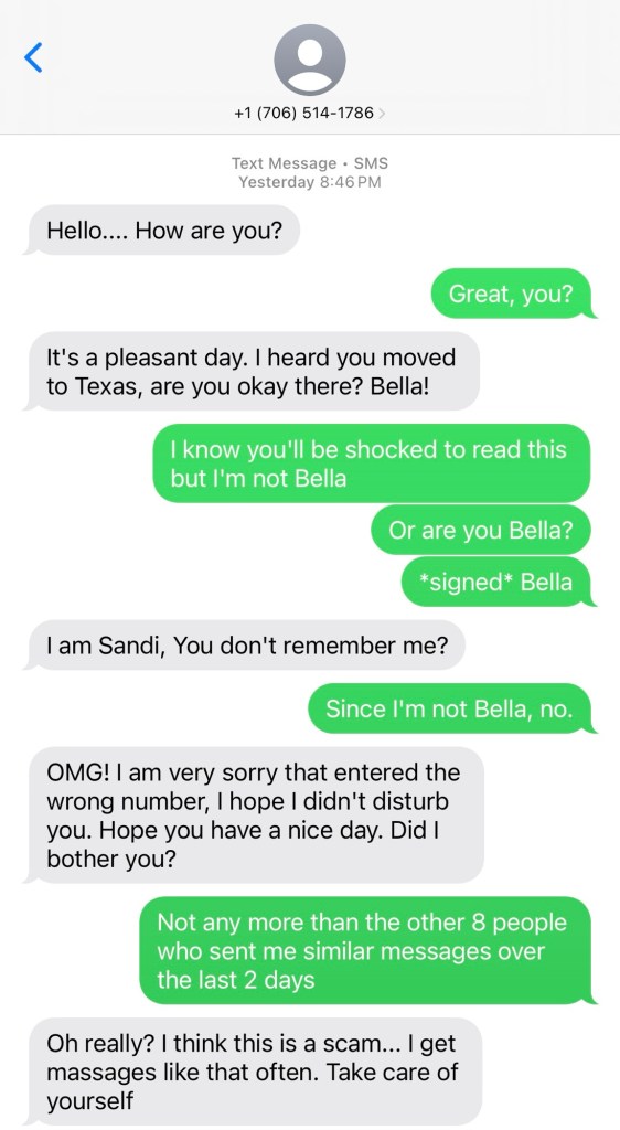 I need some help with this one. First of all, this wrong number texter is all over the place. Person, bot, or AI? It’s not really clear. You can see that it doesn’t really follow any kind of logical progression, and seems to be highly reactive, like the old ELIZA program that, if you answered a question with “no,” she’d opine that you were being negative.