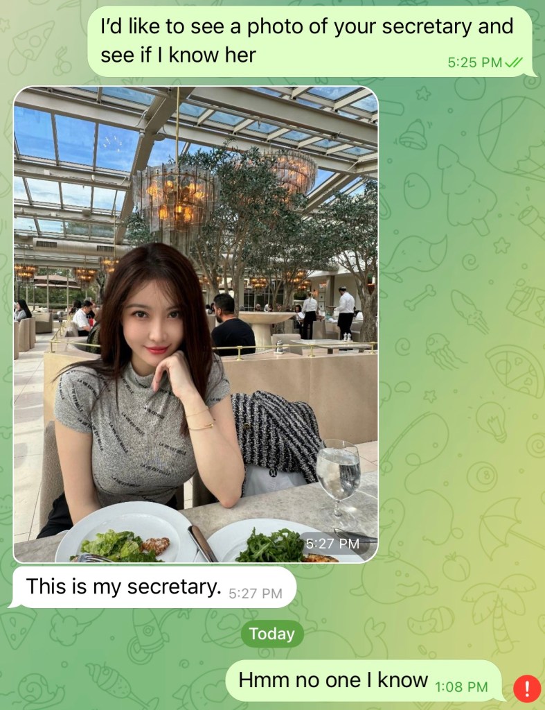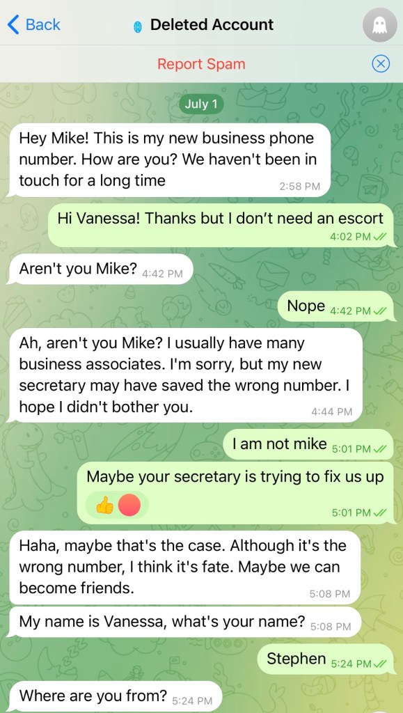 When I got this “wrong number” message on WhatsApp, I checked out the profile photo. My first thought was: online escort. (Sorry I didn’t screenshot that.) So I expressed that opinion early on.