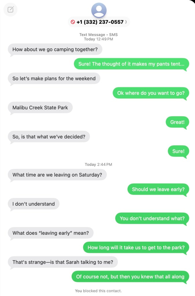 Yes, it’s another of those spammy scammy text exchanges. Lately they haven’t been playing along with my improvs very well, but this one tried a bit more than most. I really thought my first comment regarding a visible erection might put them off but it did not. In the end I stopped the conversation with a block.