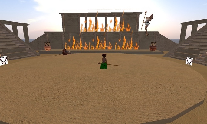 I also decided that staging Greek tragedies would be ideal in SL. After getting an in-world grant, I paid a pair of builders to create a Greek Theatre. There we staged Euripides’ The Bacchae, with actors in several states and countries, with custom costumes, props, and Bacchic dances. A few years later, I directed Aeschylus’ Prometheus Bound. Alas, the Greek Theater was gone, so we used an environment designed specifically for it. I liked my Titan avatar so much (who doesn’t want to appear god-like?) that I adopted the avatar as my regular look, just with less crazy hair. (In SL, it’s always about the hair…)