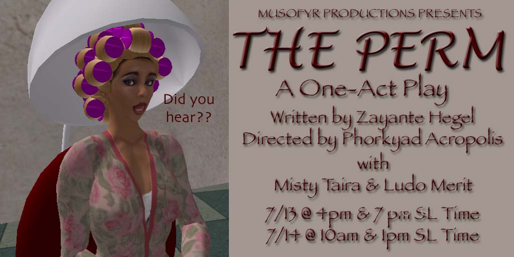 Somewhere along the way, I turned my attention to staging plays. First was avatar Zayante Hegel’s The Perm, set in a hair salon. I would later direct a production of her Orphan Train poems. (We did this in SL and also in SL and RL at the Second Life Community Convention in San Francisco. I have video!)
