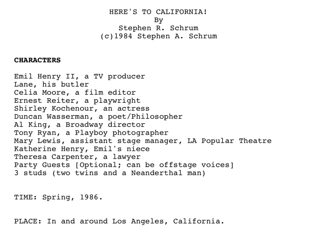 I wrote H2C! in 1984, prior to actually moving to California for my PhD. As a result, some of the material is based more on media dealing with the Golden State rather than my personal experiences. Read the play here.